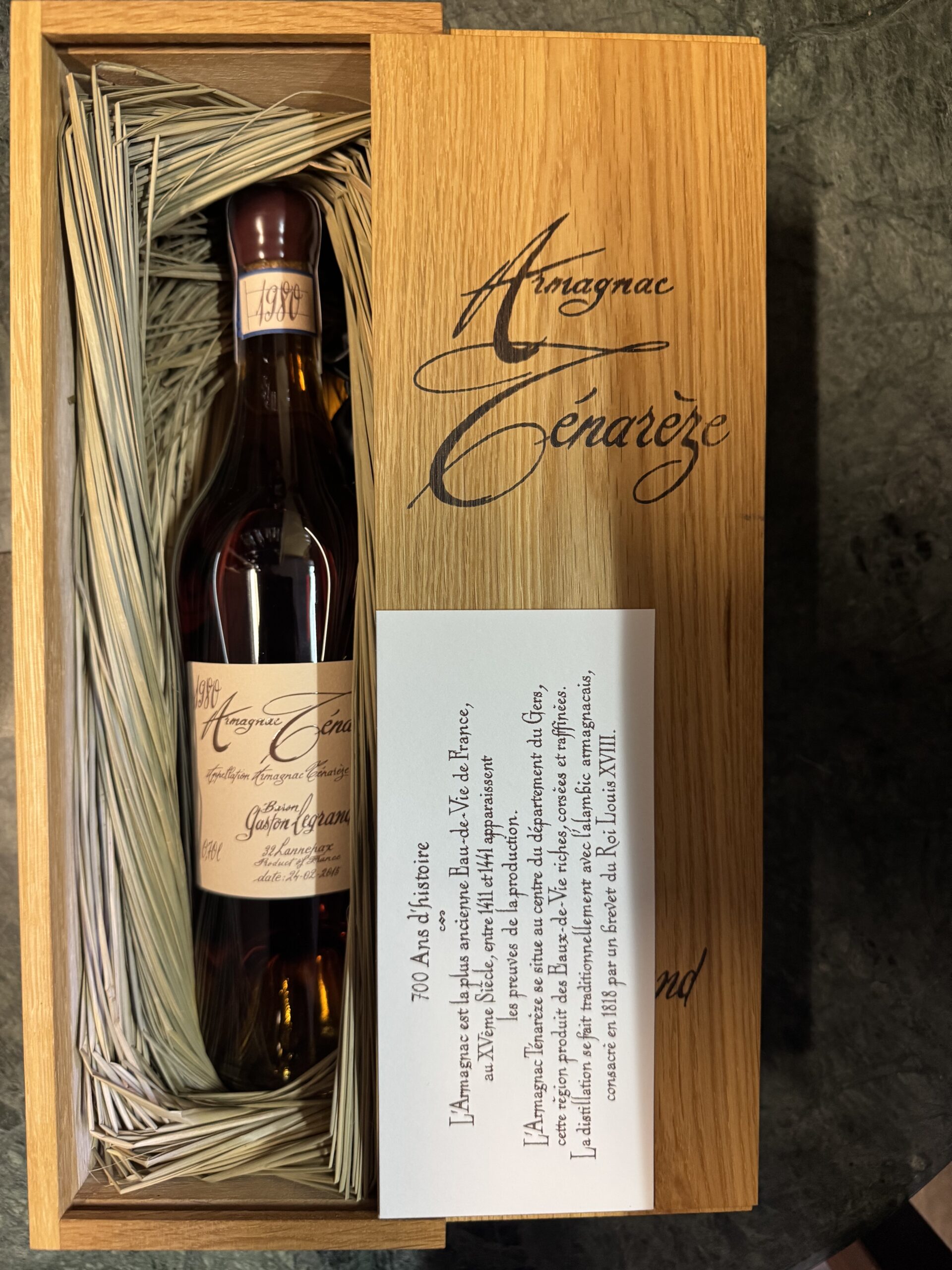 Bas Armagnac Tenareze 1980 ponúka bohatú chuť s tónmi sliviek, vanilky a jemného korenia.