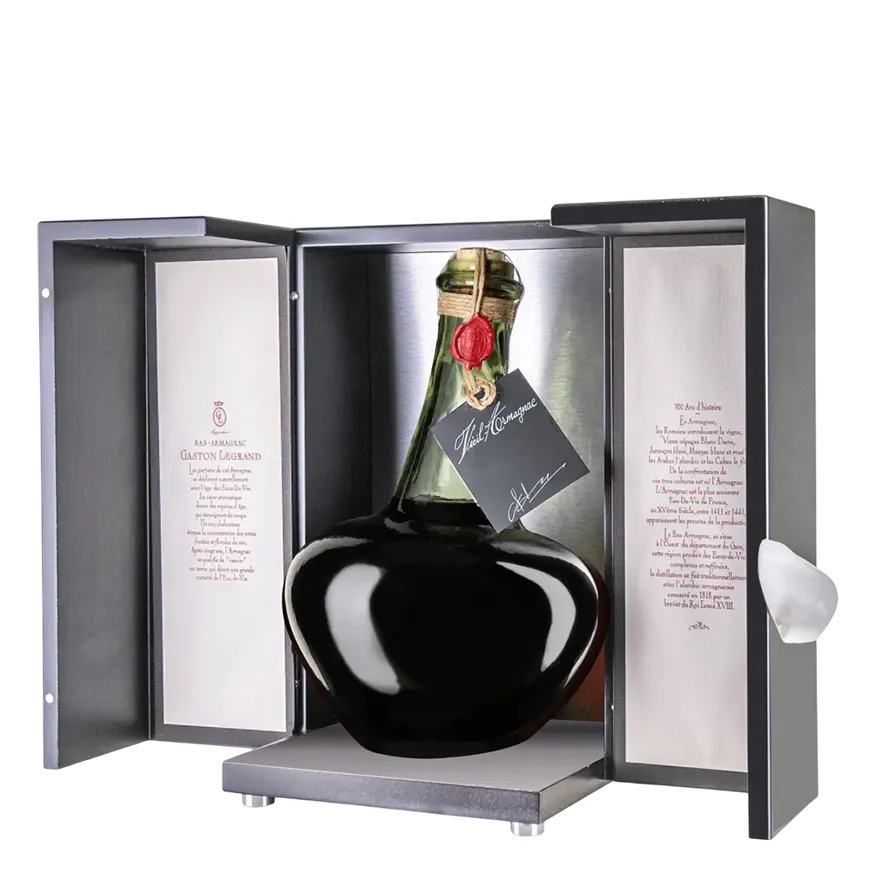Bas Armagnac Caraffe Elusa 1975 ponúka bohaté arómy sušených sliviek, čokolády a dubu s hodvábne jemnou textúrou.